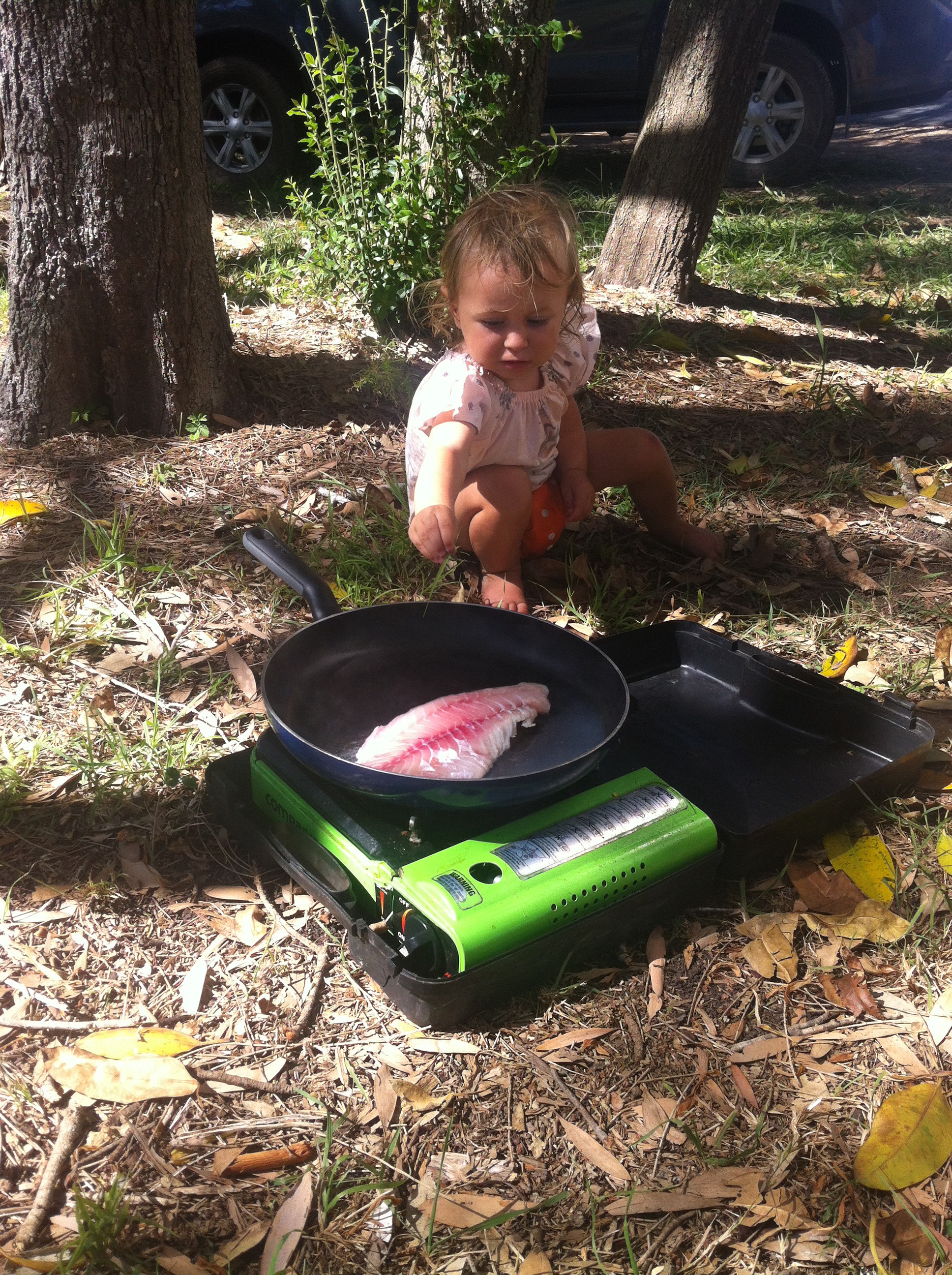 In hindsight we probably should of gone for the oysters but Yilla LOVES fish and she was so excited to walk out the door with her package and go cook it up straight away. We set the camp cooker up under a tree and Yilla impatiently prodded the fish with sticks while it sizzled.