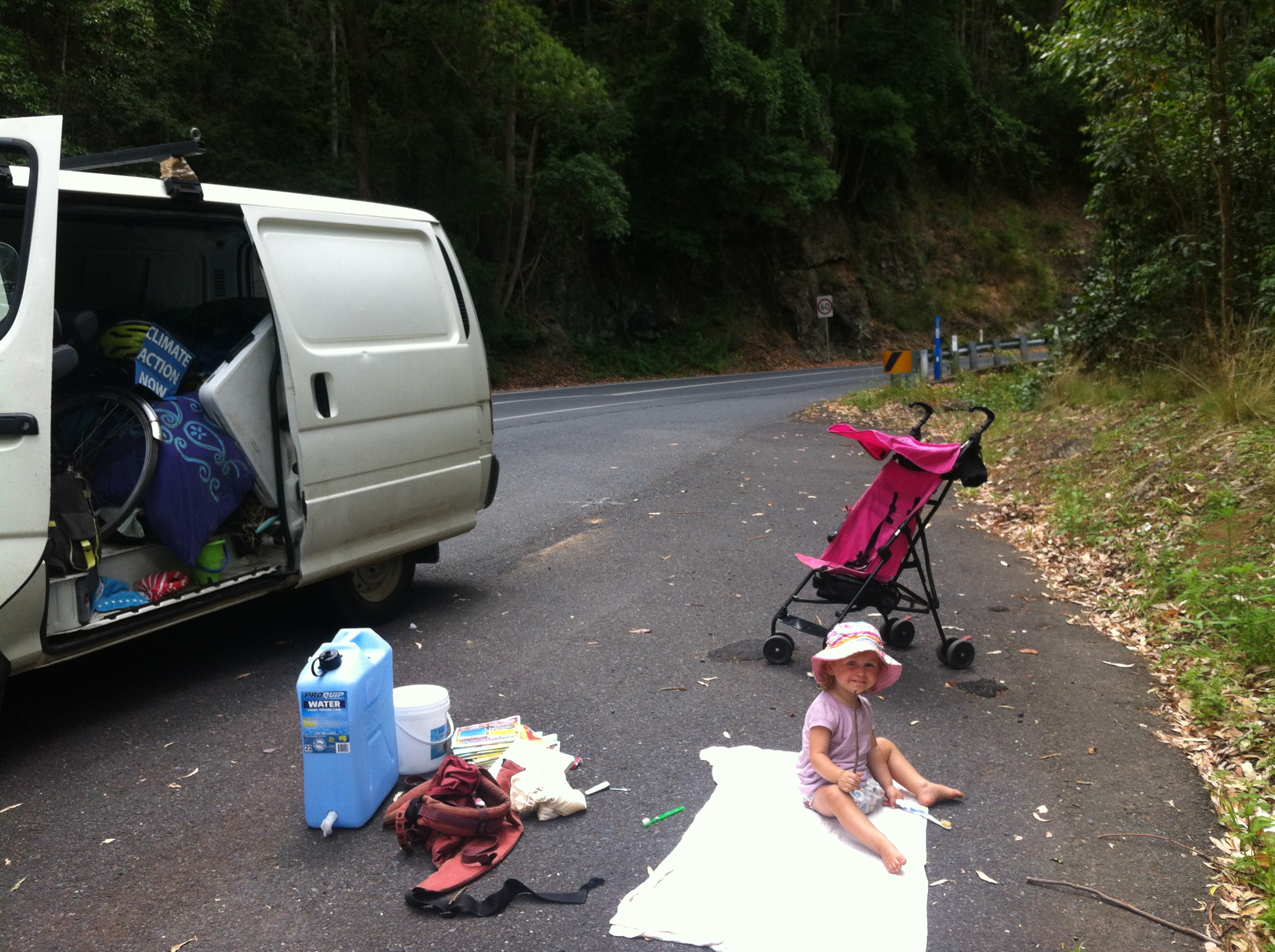 Our plan was to head straight from the environment centre back down the mountain and head south down the coast towards Sydney but fate had other ideas. Not very long after we had left the national park this sensation hit our nostrils as if a fire had been lit under our seats. And that’s pretty much what was happening. Ahhh the sweet smell of an engine being completely cooked. As fortune would have it (not!) we were on a cliff-side stretch of road with nowhere to pull over so zooming down the mountain we go, engine smoking, past the beautiful waterfalls without a second glance because I’m too pre-occupied with the mental vision of the van spontaneously combusting underneath us (being a van the engine is under the seats) until finally we could pull over and I quickly unclipped Yilla and called NRMA. They told me it would be an hour before they came. “Oh that’s fine NRMA, except we’re on a tiny shoulder on a dodgy stretch of road with no shade and trucks hurtling past and my daughter is all of a sudden desperately determined to run into the road and shapeshifts into a noodle everytime I try to hold her still. Yeah we’ll wait an hour, no problem!” So out come the distraction techniques. Out come the toothbrushes onto the road, the books, the pens, the whole kitten caboodle. The NRMA guy thought it was well funny when he pulled up, because we’d pretty much set up shop.